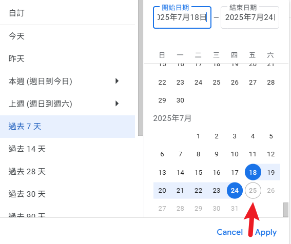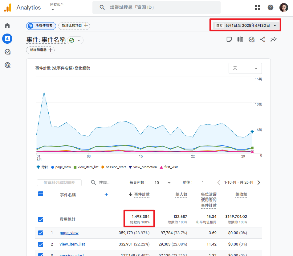- 確認右上角的時間區間為一個月,「事件計數」總和值,就是一個月的GA4 收集到的事件量。