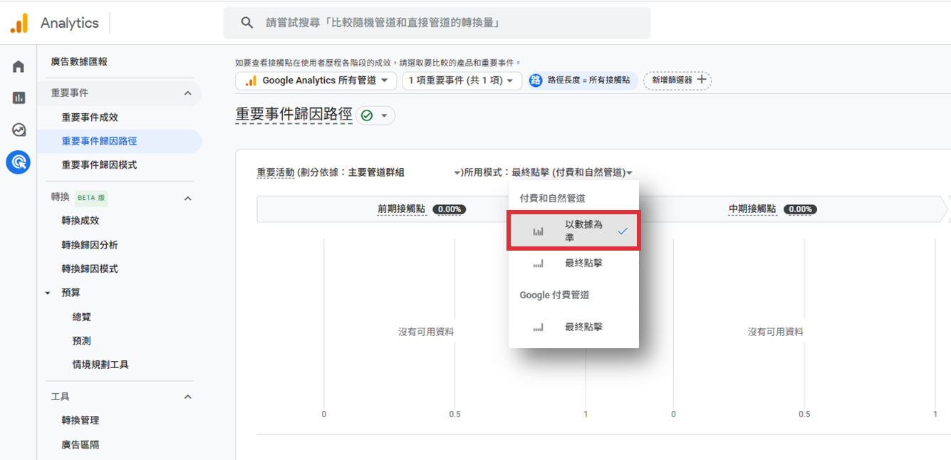 ●選擇以數據為準,主要是可以將轉換功勞分給路徑上所接觸到的管道。